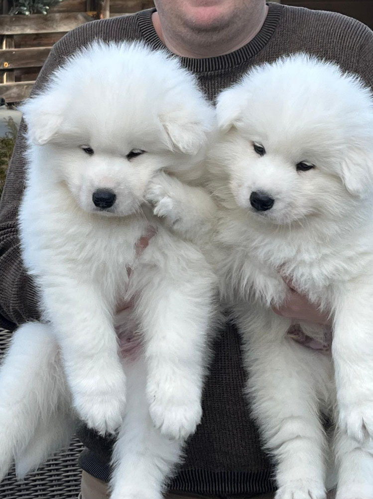 De Samojeed is een middelgrote, elegante poolhond afkomstig uit Siberië, oorspronkelijk gefokt door het nomadische Samojeed-volk om sleden te trekken, rendieren te hoeden en als gezelschapshond te dienen. Ze hebben een dikke, witte, weerbestendige vacht, een kenmerkende ‘Samojeed-glimlach’ en donkere, expressieve ogen. Het ras staat bekend om zijn vriendelijke, zachtaardige en speelse karakter; ze zijn doorgaans sociaal en aanhankelijk, maar ook energiek en intelligent. Door hun zelfstandige aard hebben ze een consequente opvoeding en veel beweging nodig. Als u op zoek bent naar een mooie Samojeed puppy met stamboom, bent u op deze pagina aan het juiste adres !