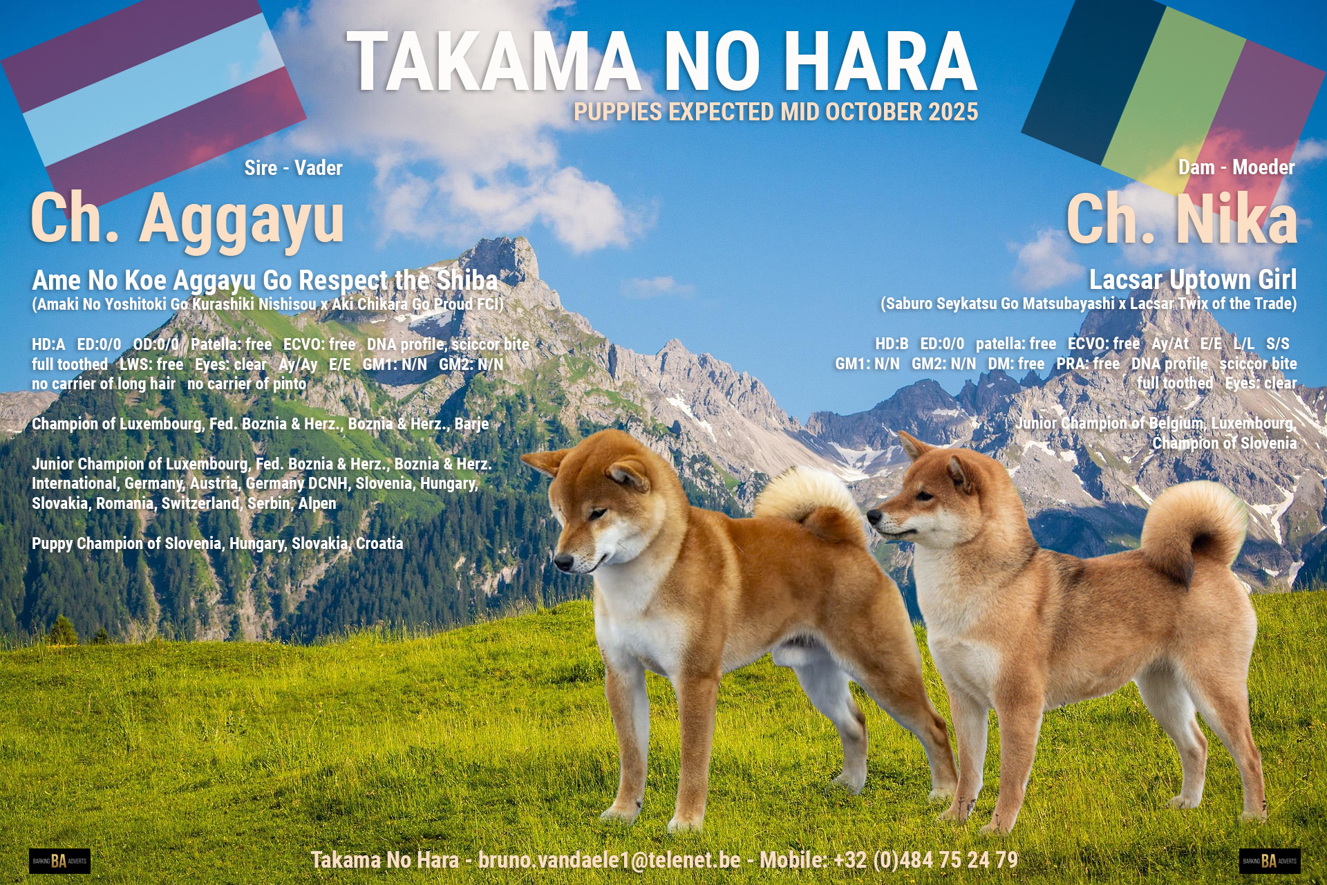 HD: A, ED: 0/0, patella free, ECVO free, At/At, no carrier of white (E/E), no carrier of long hair (L/L), no carrier of piebald (S/S), GM1: N/N, GM2: N/N, DNA-profile, scissor bite. DM en PRA vrij
